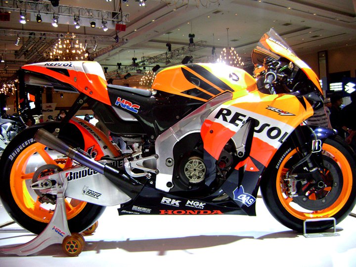 This is scene of motorcycle jakarta 2010 show event show the HONDA type RC212V, REPSOL no.4 is the brand of motorbike colour from HRC, That looks superbike motorbike- motorsport for motogp event scene.